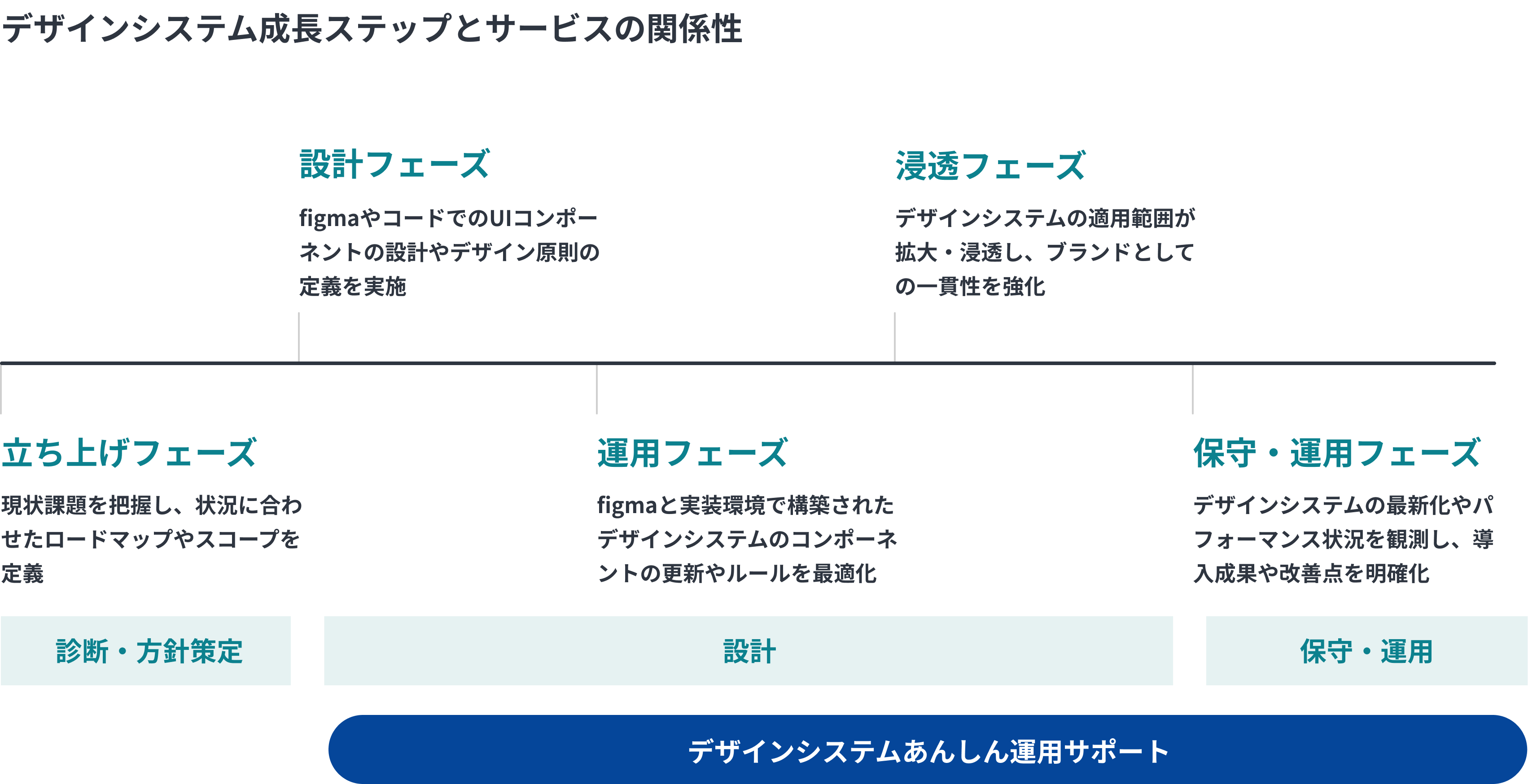 デザインシステムあんしん運用サポートは、ルール・コンポーネント・ドキュメントの更新から、Storybook等の運用基盤の維持、日々のメンテナンス対応、日本語によるサポートまでを包括的に提供するサービスです。さらにAIによる差分自動判別や定期反映機能により、煩雑な更新作業や環境管理の負担を大幅に削減し、開発チームが本来の価値創出に直結する業務へ集中できる体制を実現します。